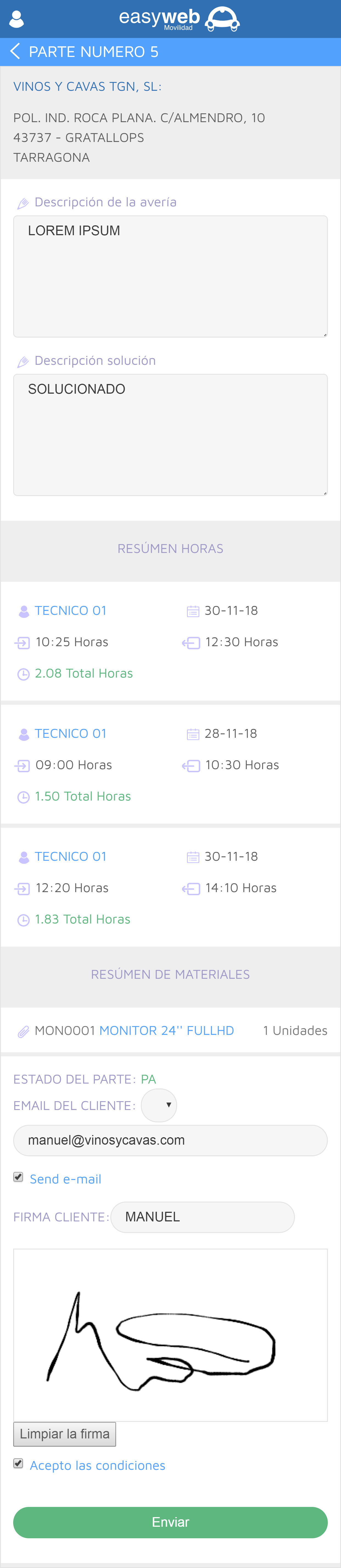Al finalizar el servicio se enviará un e-mail con el resumen de la intervención firmada por el cliente y con un PDF adjunto.