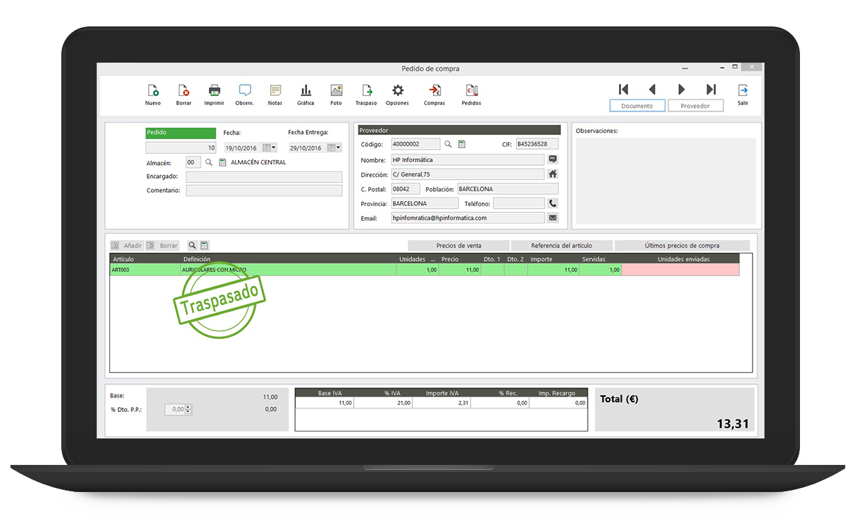 El proceso de compra recoge todo el aprovisionamiento a proveedores, como tarifas, propuestas, pedidos, depósitos, albaranes y facturas.